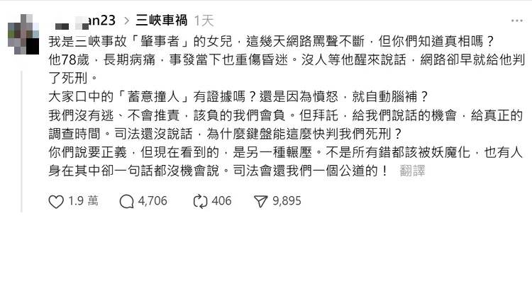 據了解,該名女網友在Threads上發文自稱是三峽事故肇事者的女兒,不滿寫下:「網路這幾天網路罵聲不斷,但你們知道真相嗎? 他78歲,長期病痛,事發當下也重傷昏迷。