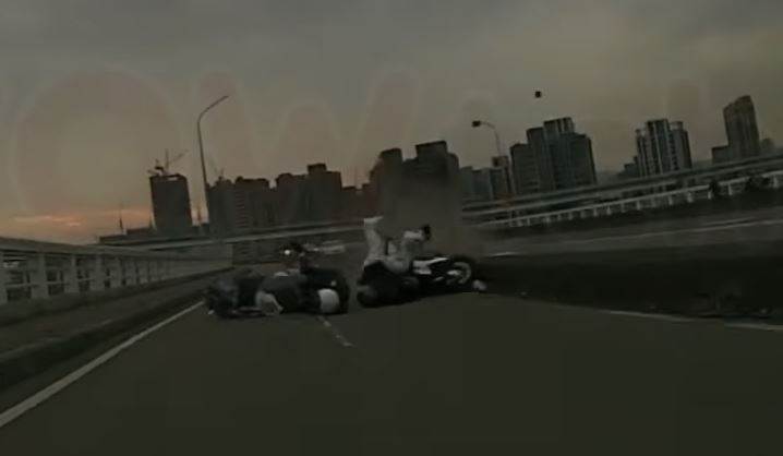 事發過程中,監視器與行車紀錄器畫面顯示,李男原行駛于機車專用道右側,欲變換車道時未能保持安全距離,直接追撞前車,導致雙方失控翻倒,三人摔落路面。