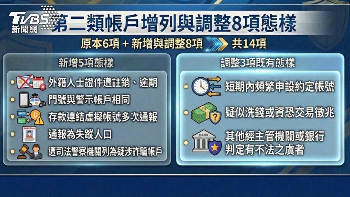 依現行規定,疑似不法或異常賬戶分為兩類。第一類賬戶包括偽冒開戶、警示賬戶及衍生管制賬戶,由警方通報,管制力道較強。第二類賬戶是具有可疑或異常表徵的賬戶,這次修法就是擴大第二類認定范圍,從原本的六項增加至十四項。新增范圍包括外籍人士居留證遭註銷或逾期、賬戶留存手機門號與警示賬戶重復、存款賬戶連結虛擬賬號並在一定期間內多次遭通報列為警示等情況,全部列為可疑賬戶。