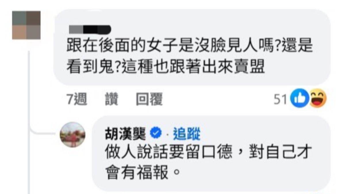 面對妻子的外貌與行為遭到網路霸凌,胡漢龑也不忍了,他親自現身留言區反擊酸民「做人說話要留口德,對自己才會有福報。」並強調自己行得正,呼籲大家與其當酸民,不如多說好話、多做好事。這番護妻言論意外讓人看見胡漢龑霸氣的一面,掀起討論。