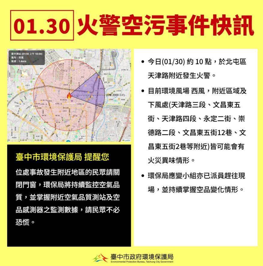 此外,台中市環保局也說明,目前環境風場偏西風,起火下風處及附近區域,皆可能會有異味情形發生,提醒民眾關閉門窗,將持續掌握空氣品質測站監測數據,不必恐慌。