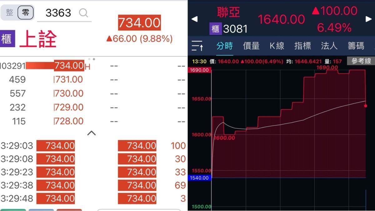 而GTC與全球光通訊產業年度盛會OFC接力登場,也助攻多檔概念股。今日相關概念股中,聯亞盤中一度亮燈漲停,股價漲至1690元,再飆新天價,其他如上詮(3363)也飆漲停,股票漲至734元,上萬散戶瘋上車搶零股買不到。東典光電(6588)109.5元漲停;眾達-KY(4977)盤中一度飆至211元漲停,最後收200.5元;其他像是光聖(6442)、華星光(4979)、聯鈞(3450)、前鼎(4908)也一度漲半根停版。
