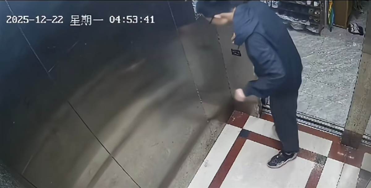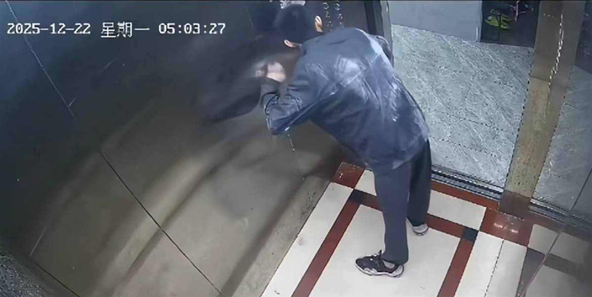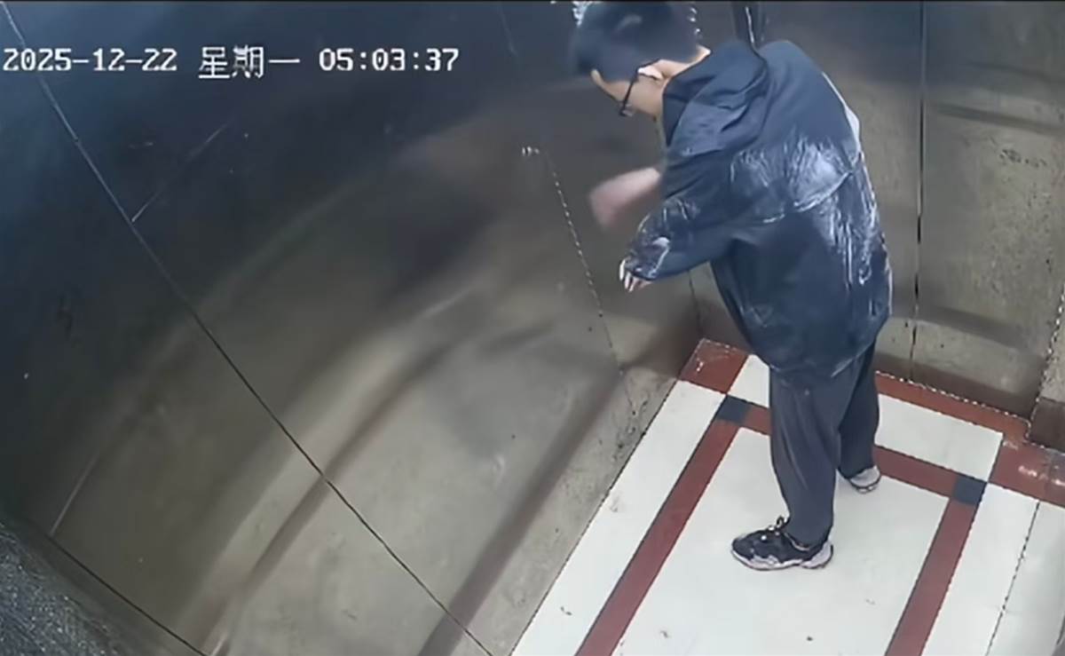 5點03分,王帥再次進入電梯,此時的他後背、胳膊上都是白色的牆灰。