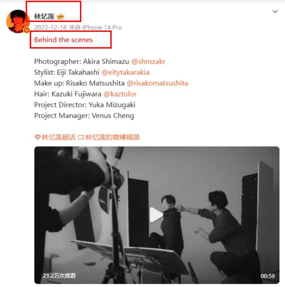 她在微博上發布了一條名為 「Behind the scenes」 的動態及相關短視訊。