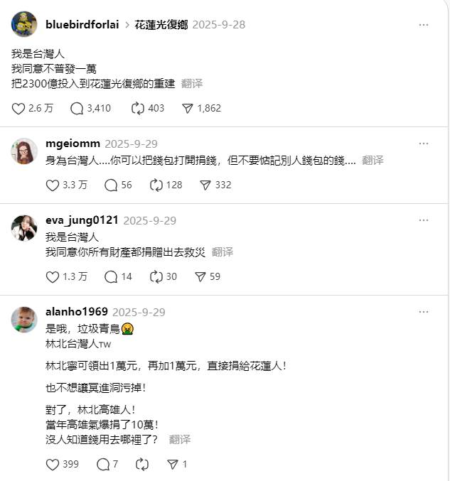 行政院日前正式通過《因應國際情勢強化經濟社會及民生國安韌性特別條例》,其中高達2360億元用于「全民普發現金」。不過馬太鞍溪堰塞湖溢流重創花蓮,有網友在Threads發起「我是台灣人,我同意不普發1萬,2300億投入到花蓮光復鄉的重建」,吸引2.6萬人按讚響應。部分民眾認為,雖然花蓮需要幫助,但確實也有人需要這筆錢,不如等拿到普發1萬再自主捐給相關單位,引起正反討論。