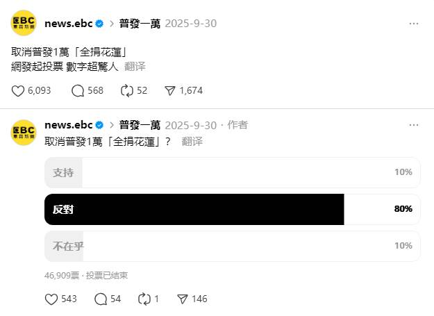 對此,《EBC東森新聞》在官網及Threads同步舉辦「是否支持取消普發1萬,全數捐給花蓮救災」投票,結果也出爐了。Threads上有46,912人參與投票,反對票高達80%,僅有10%民眾支持,另外10%則表示不在乎。