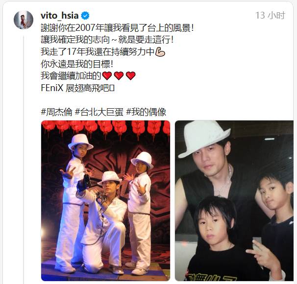 「謝謝你在2007年讓我看見了台上的風景,讓我確定了我的志向——就是要走這行!」夏浦洋在分享合照時,感慨萬分。對于這段難忘的經歷,夏浦洋至今心存感恩。他表示,正是周杰倫的音樂和他在舞台上的表現,激勵了他下定決心要成為一名歌手。這個決定,改變了他的人生軌跡,也讓他一步步走到了如今的高度。