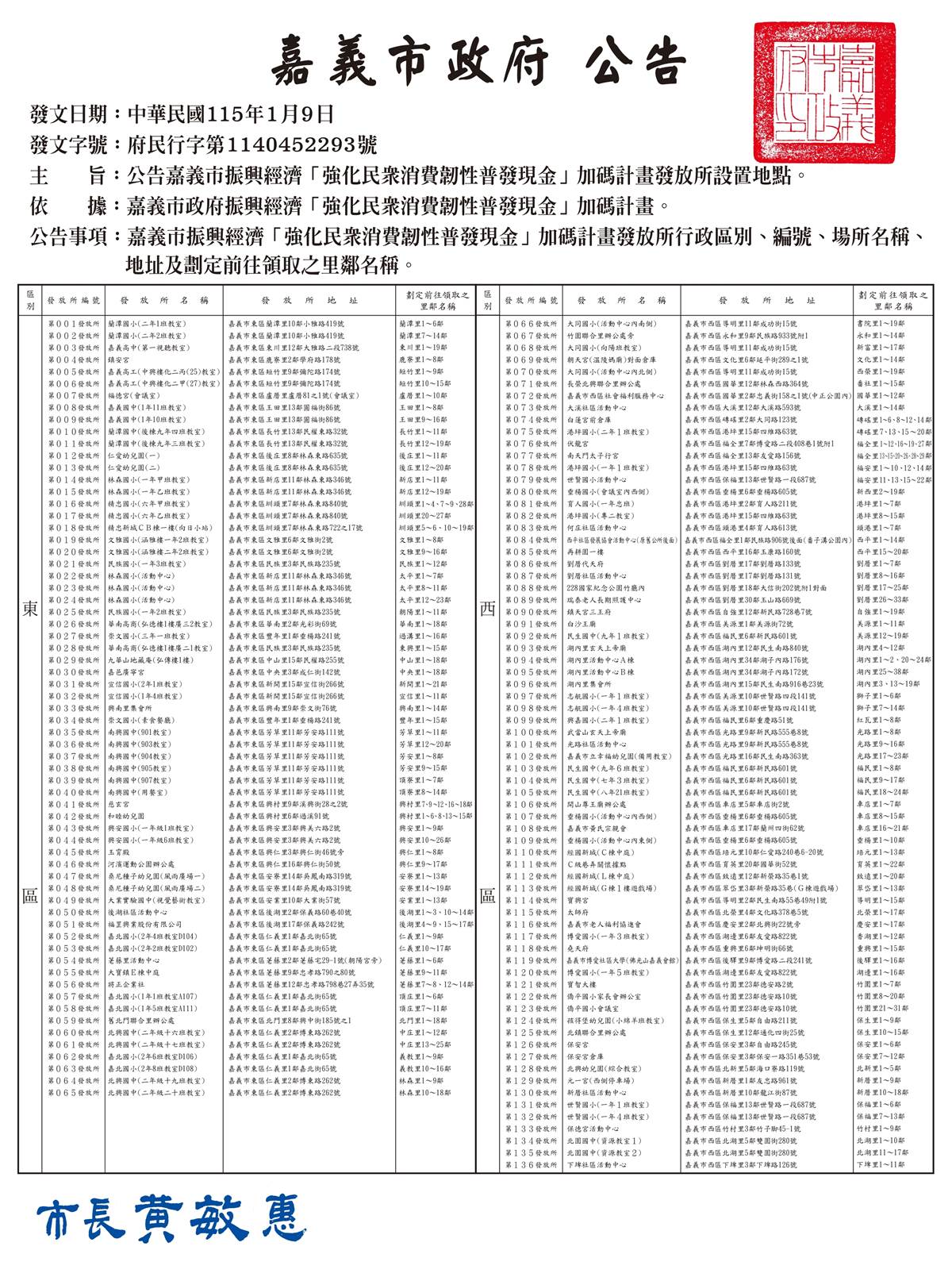 市府指出,此次「振興經濟強化民眾消費韌性普發現金加碼計畫」共設東區65處、西區71處發放所,詳細地址及各里鄰對應地點已彙整于一覽表,方便市民查詢。