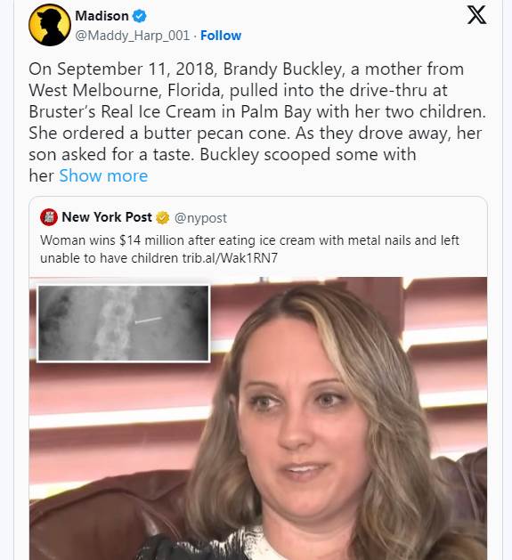 巴克蕾說,「我在紅燈時挖了一口冰淇淋,結果發現甜筒裡竟然有一根金屬釘,幾乎嵌在裡面,」起初她誤以為吞下的是堅果,但癥狀異常,緊急就醫後透過X光檢查才發現真相。「我以為那是山核桃,但其實不是,是一根釘子。我真的吞了一根釘子。」