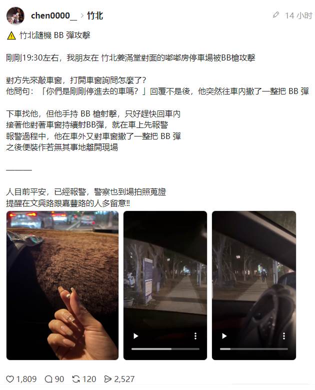 竹北市昨(28日)發生驚悚的隨機射BB彈攻擊事件,有位男子拿著BB槍隨機亂射車輛,還往民眾車內亂撒「彈藥」,目前已被警方找到人逮捕,將依相關法條偵辦。
