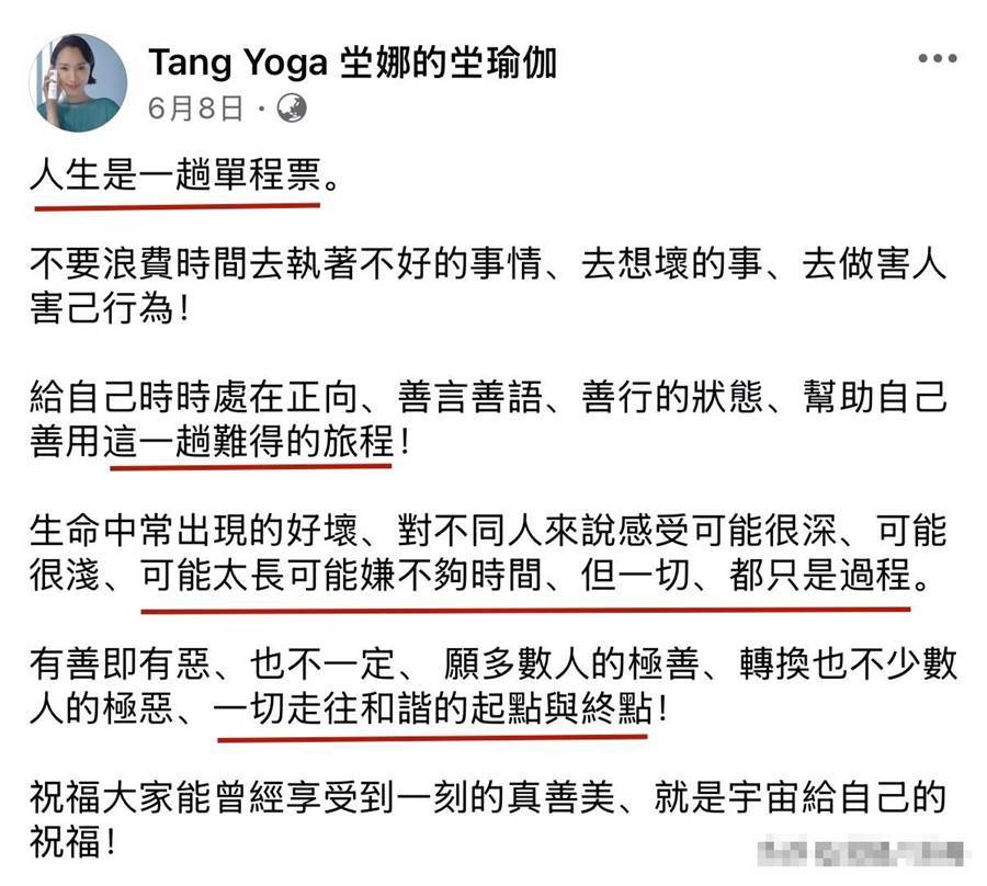坣娜生前發布的最后一條動態中,提到「人生是一趟單程票」,可能生命不夠時間,但一切都只是過程,都將走往和諧的起點與終點。
