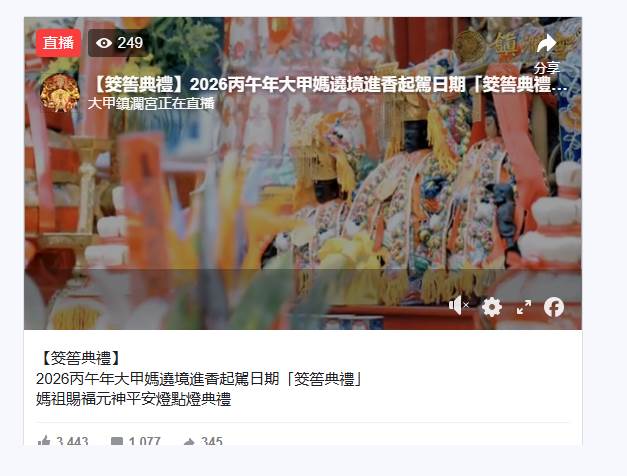 經3日元宵節「筊筶典禮」擲筊,確定臺中大甲鎮瀾宮媽祖將在4月17日晚間10時5分起駕遶境。(圖/翻攝自Facebook@大甲鎮瀾宮)