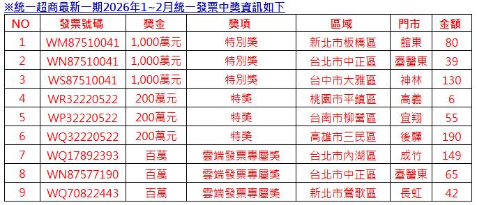 財政部于今(25)日公佈2026年1~2月統一發票中獎號碼,7-ELEVEN在本期開出3張千萬特別獎、3張200萬特獎及3張雲端發票專屬獎100萬,共9名幸運兒,其中1位超級幸運兒僅花39元購買民生用品就中得1,000萬元大獎,200萬特獎得主更只花6元手續費就抱回大獎。