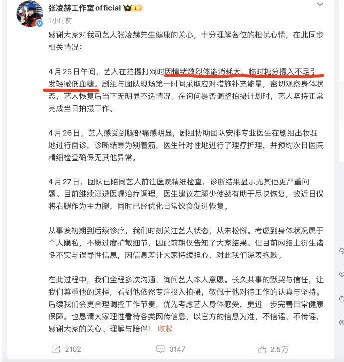 張凌赫近期新戲《歸鸞》拍攝,從現場的畫面可見他席地而坐,度嘗試起身未果,最終在林與工作人員協助下才成功站起,另一段片段是他由工作人員攙扶下車、步履蹣跚。傷勢讓大批網友擔心,工作室今(28)日發聲,透露他25日因武打戲緒激昂與體力消耗,加上糖分攝取不足,才導致輕微低血糖。