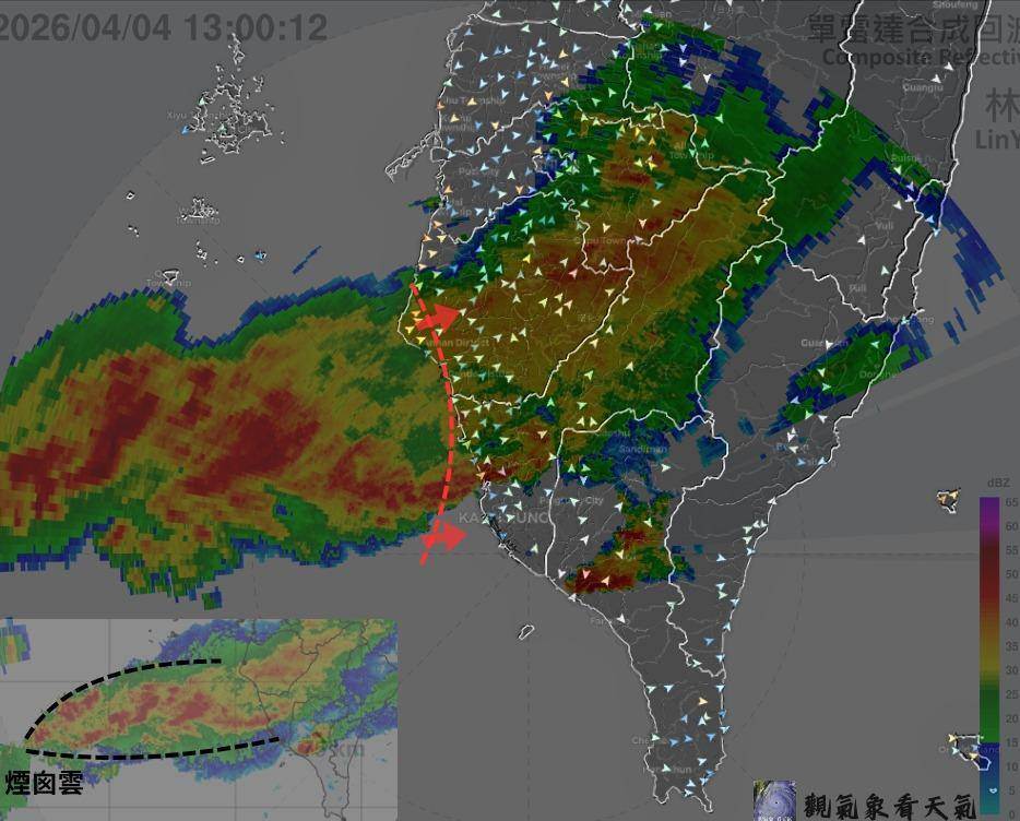 受鋒面影響,西半部4日降下豪雨,氣象粉專「觀氣象看天氣」指出,午後南高屏近海出現「煙囪雲」,且有部分對流上岸,提醒臺南、高雄留意持續性降雨、雷擊與強陣風。