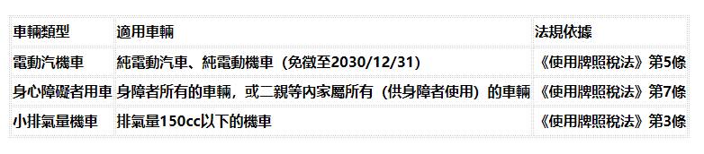 2026年台灣牌照稅0元的免稅資格共有3類:電動汽機車(免徵至2030年12月31日)、符合條件的身心障礙者用車(每人限1輛),以及排氣量150cc以下的機車(自用年稅額0元)。根據財政部與《使用牌照稅法》的規定,以下三種車輛免徵牌照稅: