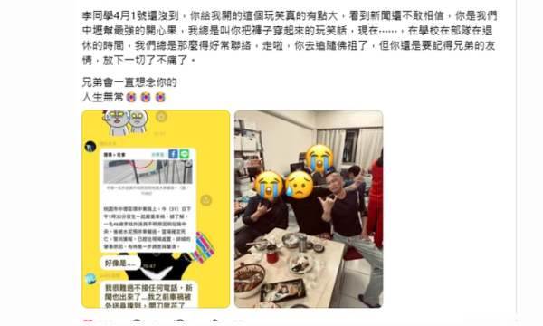 就在全網熱議交通事故真相之際,稍早有死者的好友在網路上曬出李姓外送員的私下生活照,並發文哀悼:「李同學,4 月 1 號還沒到,你給我開的這個玩笑真的有點大,看到新聞還不敢相信。」