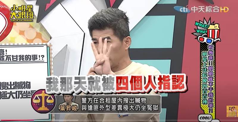 根據《三立新聞》報導,葉昇峻近日在「小明星大跟班」節目分享自己的人生故事,20幾年前他與三人合租公寓,不過出入的人員很復雜,某天警方持搜索票前來搜查,在屋內發現搶案贓物,屋內所有人包含房東都遭到逮捕。這起案件涉及13件搶劫案,當時有4名被害人指認他就是嫌犯,而他當時失業又無法提出不在場證明。