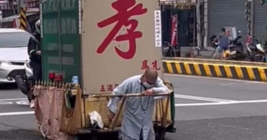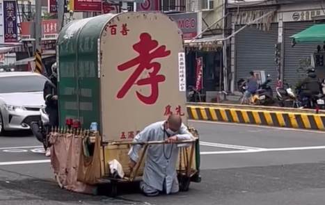 一位網友在社群平臺Threads分享影片,可見一名僧侶在街頭賣力跪地拖行棺材車,緩慢向前移動,上面還寫著「百善孝為先」,引起路人關注,原PO也直呼「看了心也是酸酸的SS級人物」。