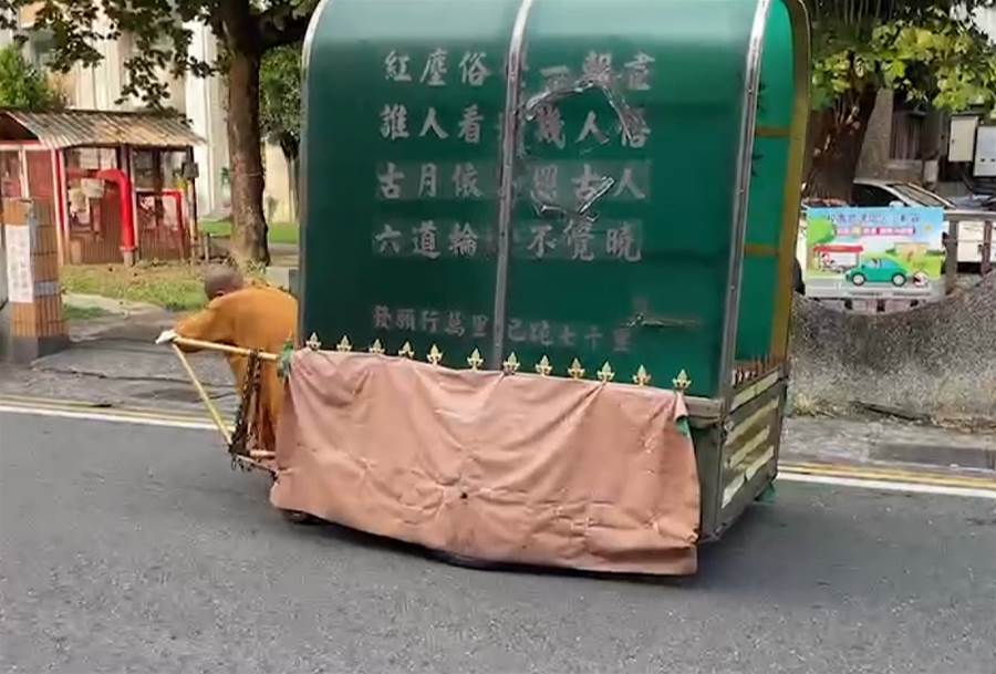 屏東有民眾近日在街頭上目擊一位僧侶「跪行」拉棺材車,將畫面拍下來分享到網路,引發網友討論。事實上,該名僧侶是為了勸世並發揚孝道,才拉著棺材四處行走,目前已走了20多年。
