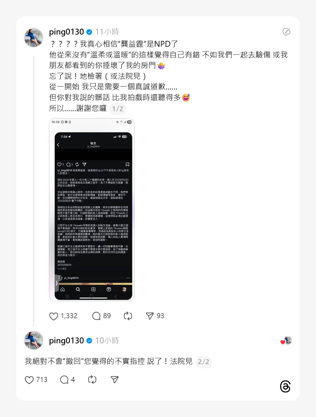 龔益霆昨日公開發文回應指控,提及2024年10月23日起正式與江祖平交往,過程中常有爭執,幾度分合後,在2025年8月31日正式分手。並指江祖平在Threads所發貼文都是片面之詞與不實指控,除了請對方撤下不實發文,並願意配合任何司法調查。