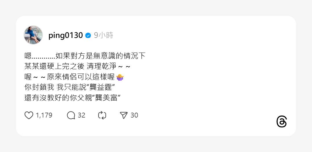 」她下一則發文回應龔益霆的聲明,「對您跟家人造成困擾?需要我把跟您父母親跟我對話的截圖發上來嗎?我真心、真的、只希望有『誠心悔改道歉』而已,但您要繼續這樣顛倒是非?」她文末用了雙手一攤表情符號。