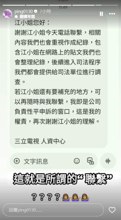 同時江祖平也在IG限動貼出三立人資的訊息,並打上字回應「這就是聯繫?」訊息內容首先感謝她的電話聯繫,相關內容會重視作成紀錄,對方說明:「後續進入司法程序我們都會提供給司法單位進行調查。