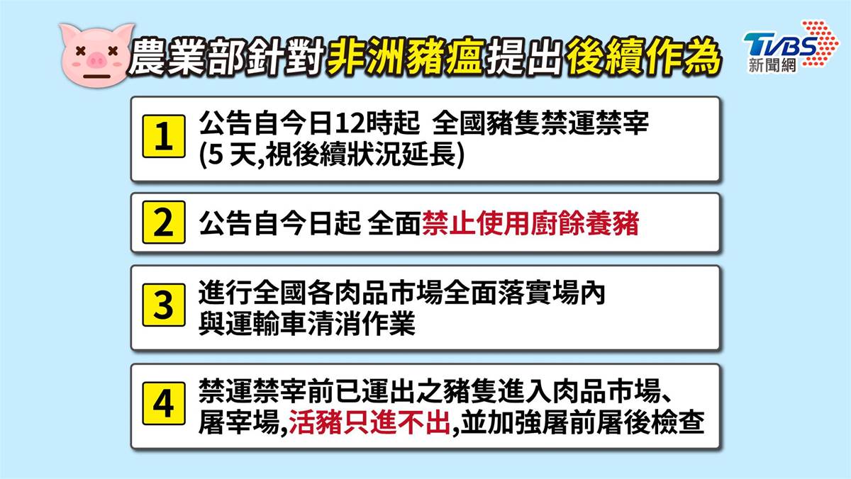 自今日12時起全國豬隻禁運禁宰5天,視后續狀況延長。 自今日起全面禁止使用廚餘。 進行全國各肉品市場全面落實場內與運輸車清消作業。 禁運禁宰前已運出之豬隻進入肉品市場、屠宰場,活豬只進不出,並加強屠前屠後檢查。 啟動全國各縣市豬場防疫調查,掌握豬隻健康狀態。