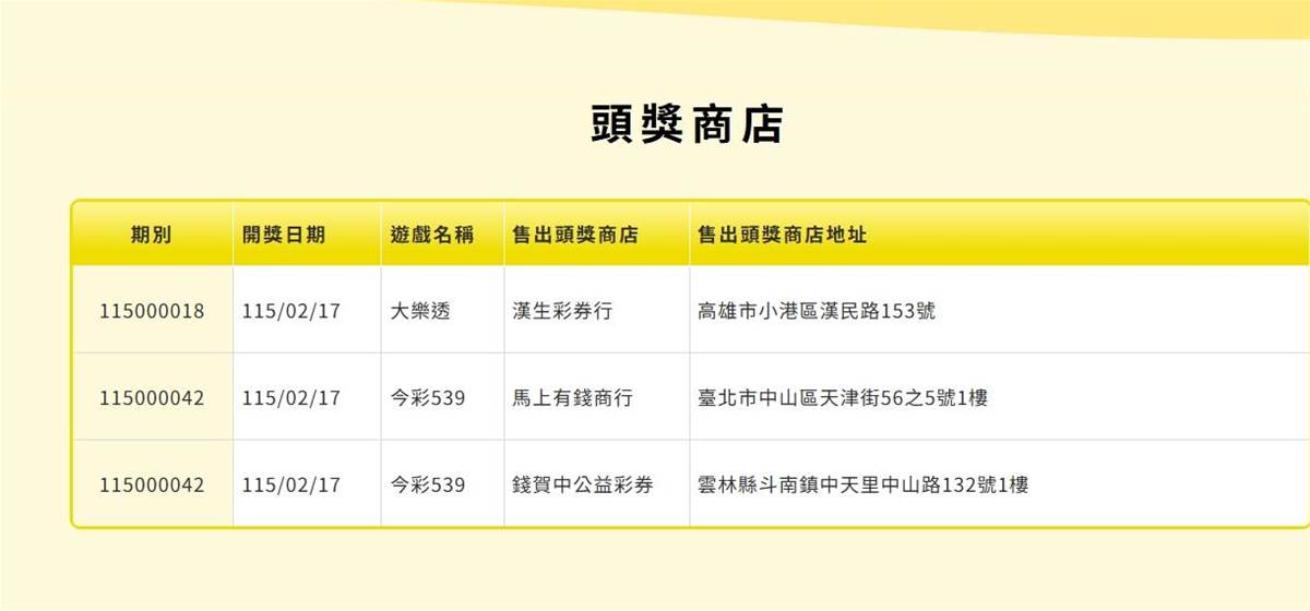 根據開獎資訊,115000042期今彩539在同期開出兩組頭獎,其中一組由位于臺北市中山區天津街56之5號1樓的「馬上有錢商行」售出,另一組則由雲林縣斗南鎮中天里中山路132號1樓的「錢賀中公益彩券」售出,大年初一讓這兩家彩券行同時成為幸運據點。