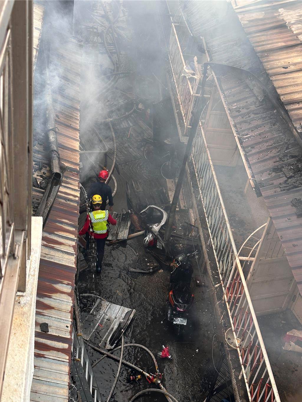 據嘉義市消防局的救援資訊,事發地點在興業東路145巷內,時間是4點52分,獲報後立刻出動人車趕往,抵達後發現起火的是木造鐵皮建物,但現場是窄巷,又都是連棟結構,火勢蔓延極快,巷子更是窄到連轎車都開不進去,狀況相當危急。