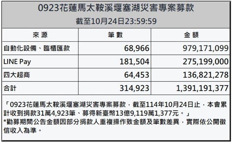 賑災基金會今(27)日晚間公布,募款筆數合計31萬4923筆,金額13億9119萬1377元。其中自動化設備、臨櫃匯款共6萬8966筆,金額9億7917萬1099元;LINE Pay共18萬1504筆,金額2億7519萬9000元;四大超商則是6萬4453筆,金額1億3682萬1278元。
