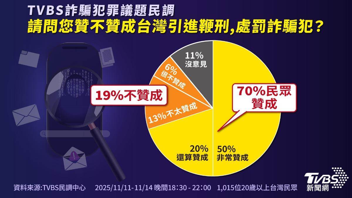 台灣詐騙猖獗日前新加坡研擬修法,計畫以鞭刑作為打擊詐騙的新手段,新加坡國會5日三讀透過「刑事法(雜項修正)法案」,詐騙相關罪犯將面對鞭刑在內的刑罰。有立委呼籲台灣應思考是否能學習新加坡措施,才能有效嚇阻犯罪。根據《TVBS民意調查中心》調查顯示,有70%民眾贊成(50%非常贊成,20%還算贊成),明顯高于19%不贊成(13%不太贊成,6%很不贊成),11%沒有表示意見。