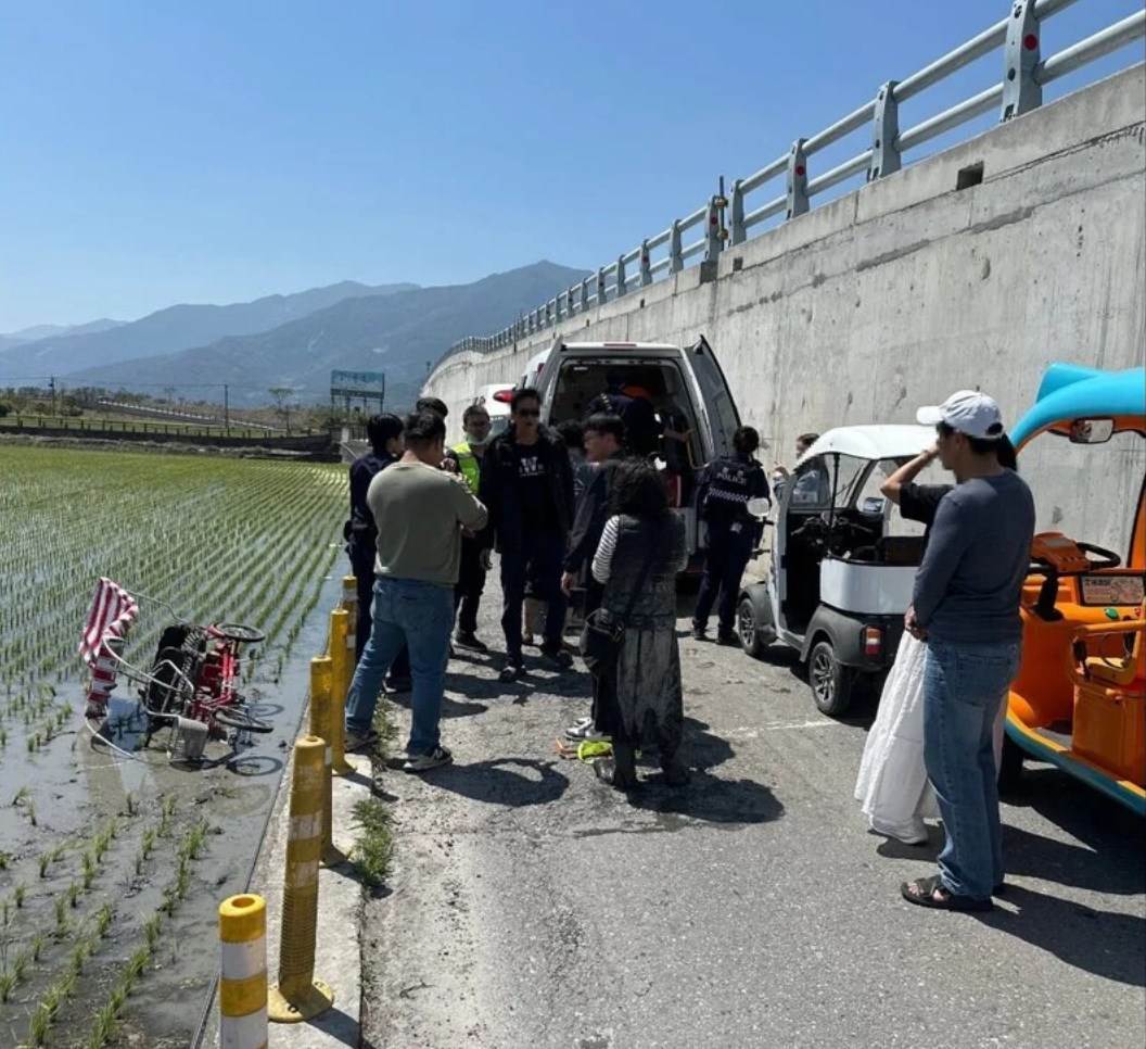 知名景點驚爆駭人意外!台東縣池上鄉池上大橋14日發生翻覆事故,1輛電動腳踏車失控衝進田裡,車上4名受傷遊客傳有1人骨折,警消緊急將4人送醫救治,所幸4人意識清楚無生命危險。