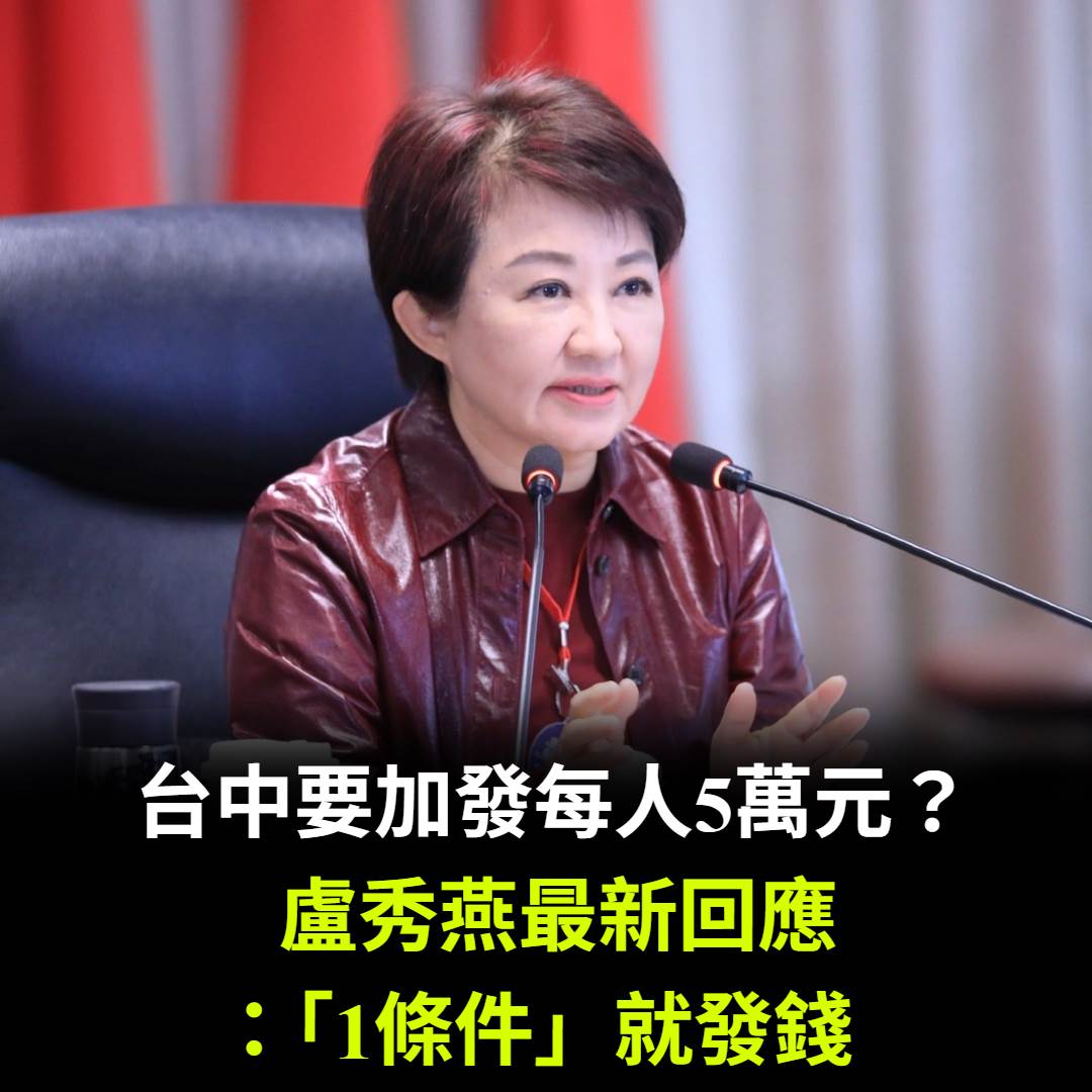 民進黨臺中市長參選人、立委何欣純日前在市議會民進黨團幹部交接場合,當著現任市長盧秀燕面前大膽喊話,若她當選市長將推動「城市紅利共享」政策,讓全體臺中市民都能領到現金。對此,盧秀燕21日在市議會臨時會上被民眾黨議員江和樹問到是否會跟進普發現金時,給出正面回應表示「有錢我也想普發現金」。