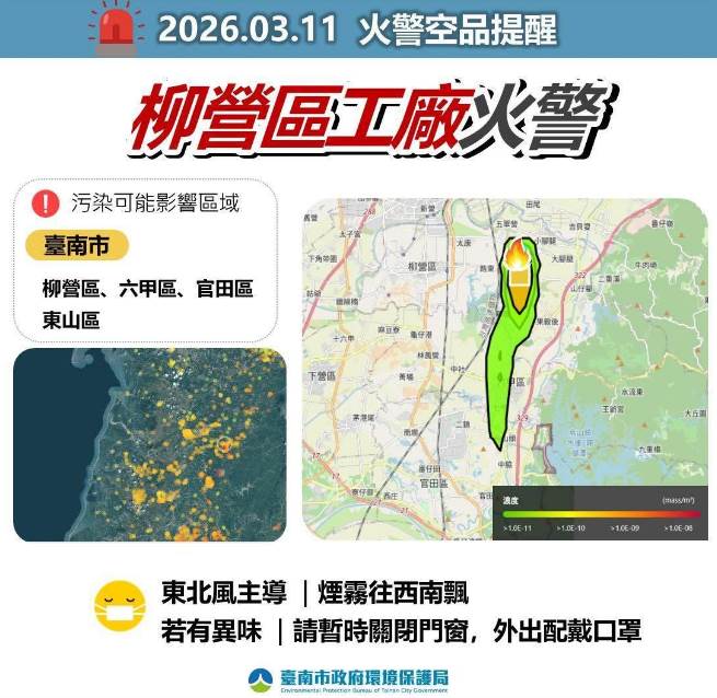 環境事故處理小組也在約10分後抵達,現場確定有囤放大量氯化銨,長時間超過300度會有腐蝕性,消防局也已主動通知環保局,進行空汙部份監測,整起火勢至清晨7點33分撲滅,臺南市環保局也緊急在臉書上發文,目前風向為東北風,柳營區、 六甲區、 官田區、 東山區的空氣品質可能受影響,位在提醒范圍的民眾關閉門窗,如需外出,請戴口罩做好自我防護,環保局將持續監控空氣品質,並掌握附近空氣品質測站及微感器之監測資料,請民眾不必恐慌。