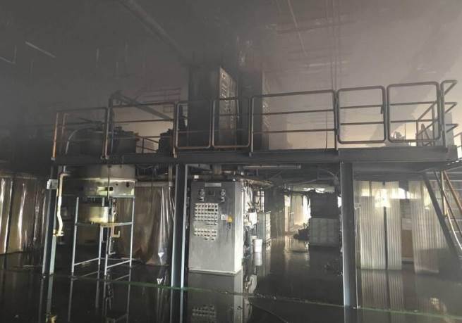 場內存放物品據了解疑似是氫氧化鈉及鹽酸跟氯化銨,起火點是1層挑高建物的2樓,廠方表示廠區共3人,警衛室2人共5人皆已逃出,消防局接下來主動增派三、四、五大隊的補給車輛,包括泡沫、氣瓶、油桶車,以及大橋特搜分隊、特搜大隊。