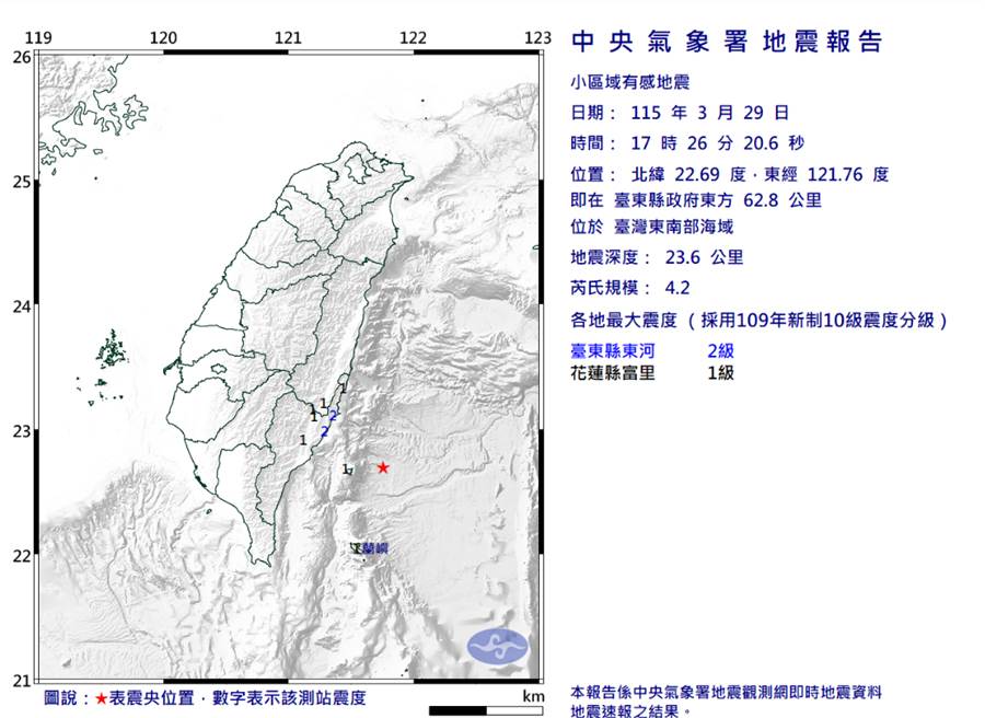 今天(29日)地震不斷,全臺各地噴發,截至出稿時已經3起,首先在今天上午11點12分屏東縣來義鄉發生規模4.7地震,再來是12點36分嘉義縣阿里山鄉發生芮氏規模4.0地震,稍早前,17時26分,台灣東南部海域發生芮氏規模4.2地震。地震震央位于北緯22.69度、東經121.76度,距離臺東縣政府東方約62.8公里,震源深度為23.6公里,屬于「極淺層地震」。