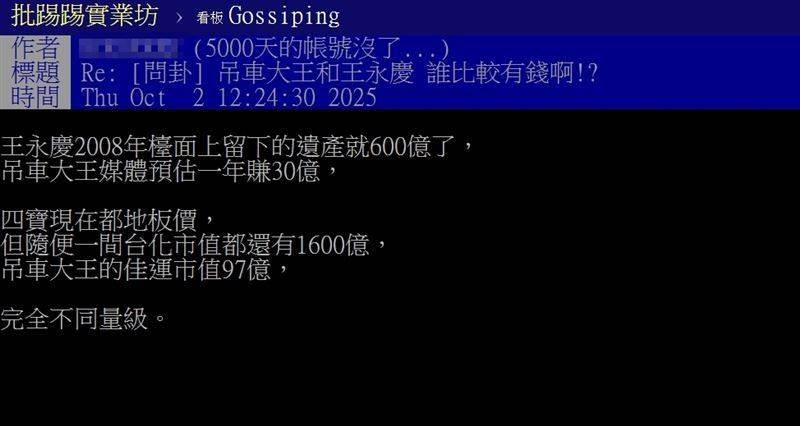 此外,有專業網友分析:「王永慶2008年檯面上留下的遺產就600億了,吊車大王媒體預估一年賺30億。