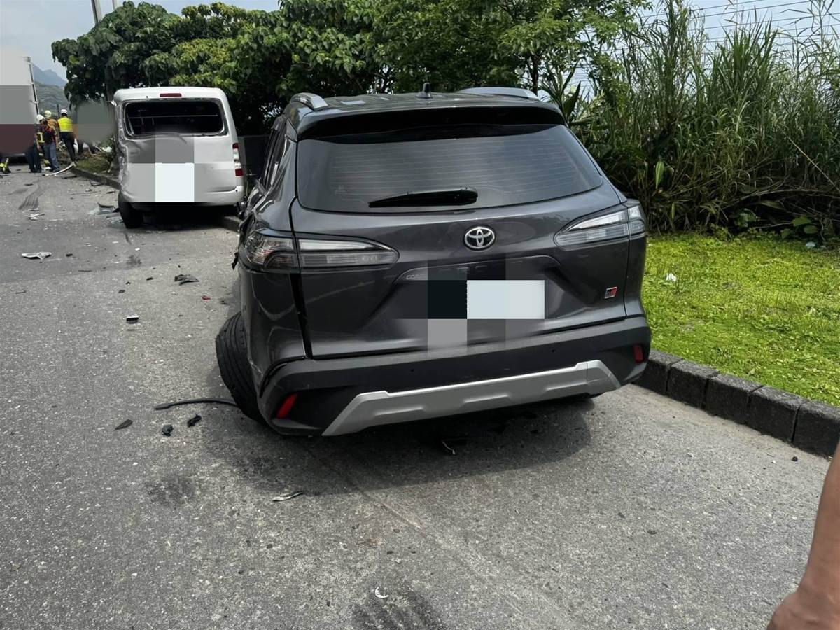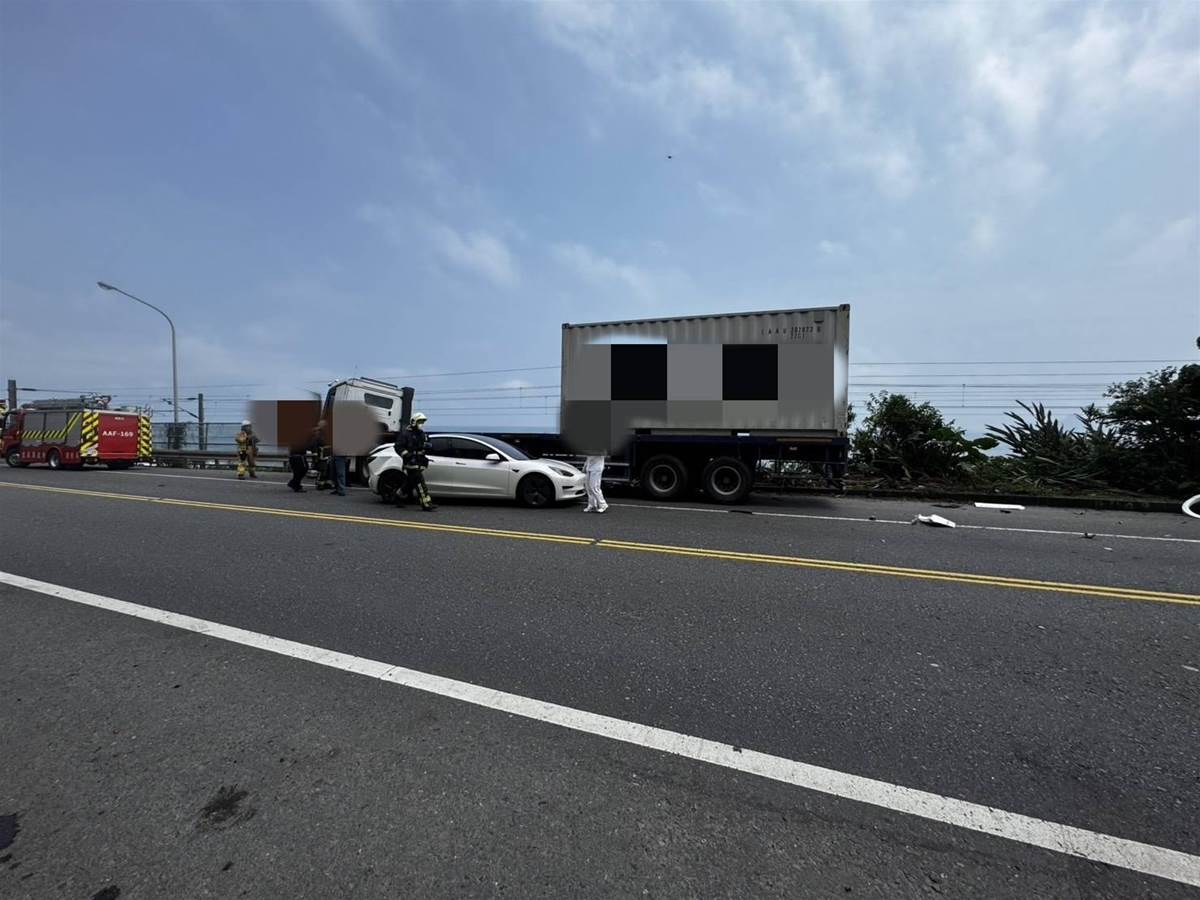 據警方的調查,交通事故發生經過是有輛砂石車在今天中午12點50分左右,行經台2線北上方向118公里、大里天公廟前時發生爆胎,整輛車失控偏移猛力撞擊路邊停放的5輛車,現場撞得相當嚴重,砂石車甩停在路邊,5輛轎車車身也嚴重變形,還有一輛特斯拉轎車「黏」在砂石車旁,其中一輛還被撞落邊坡,差點滑到鐵軌上,而所幸整起交通事故僅有肇事駕駛有輕微受傷,其餘車輛內的民眾全都毫髮無損,可說是不幸中的大幸。