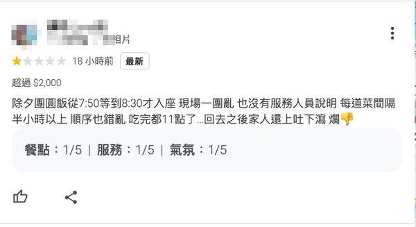 另外還有消費者留言「菜都是冷的也不熱,吃完都11點多了,回去之後家人們還上吐下瀉」、「每道菜間隔半小時以上 順序也錯亂 吃完都11點了…回去之後家人還上吐下瀉 爛。」
