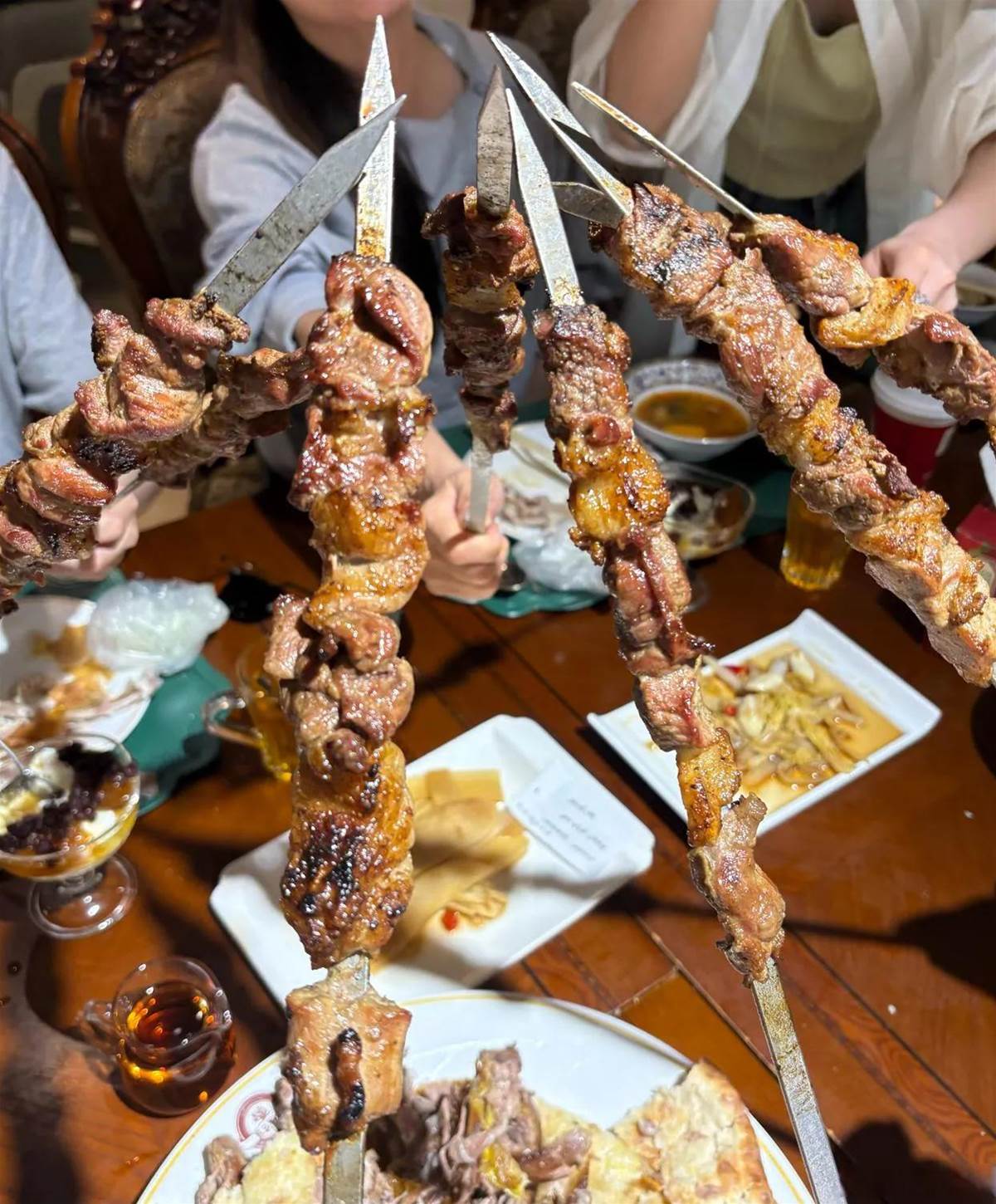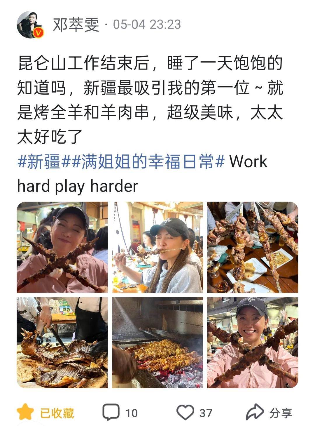 可見她對新疆的美食是真的喜愛啊,桌上擺滿了羊肉串和烤全羊,還和朋友們拿著羊肉串干杯。在社交平台上分享了自己的美食體驗,字里行間都充滿了興奮和滿足!她用了「超級好吃」、「太美味了」等詞語來形容新疆美食,可見新疆美食的魅力確實無法抵擋!