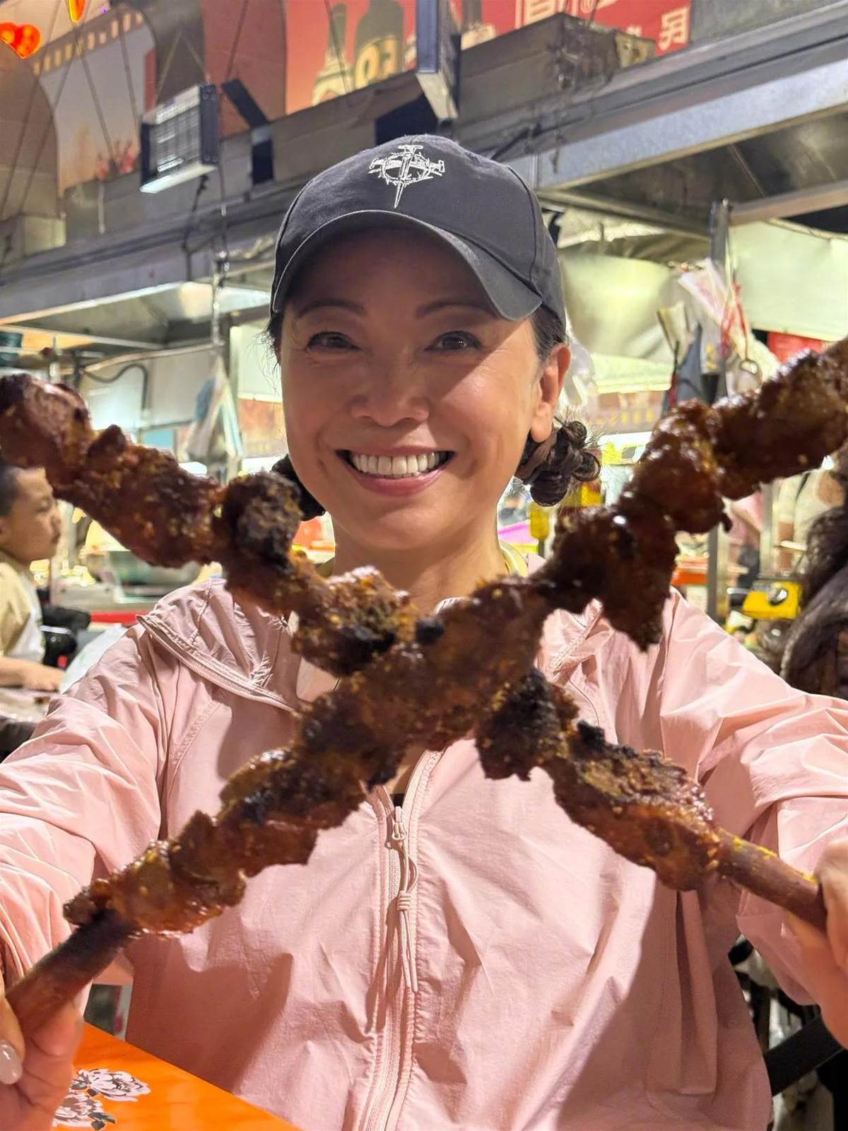 在另外她分享的照片里,她也是戴著黑色的鴨舌帽,穿著粉色的外套,頭髮扎成2個低丸子頭,笑容燦爛,手里拿著2串羊肉串比劃著,儼然是一個活潑可愛的少女,紅光滿面,神采奕奕的,這個狀態真的是絕了!