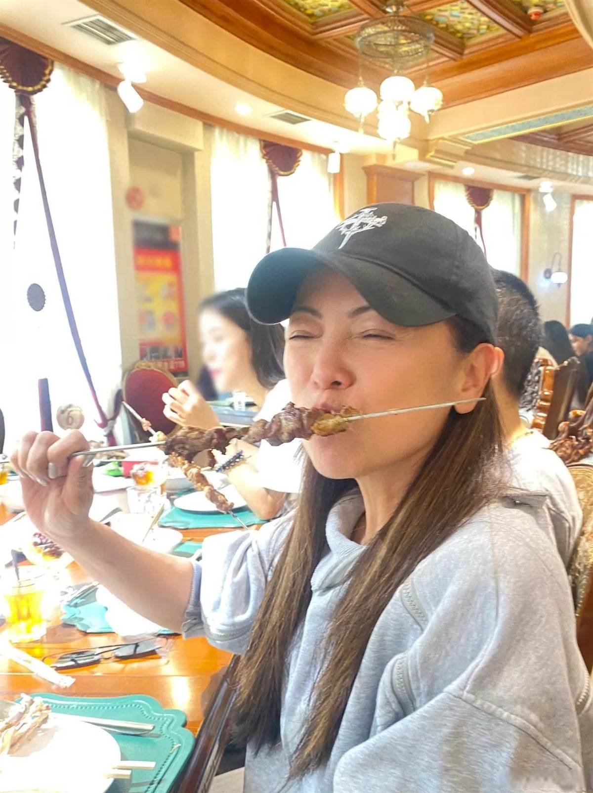 只見她穿著灰色的衛衣,戴著黑色的鴨舌帽,披著長發,拿著一串羊肉串,一臉享受閉著眼睛吃起來,沒有過多的妝飾,看起來就像少女,誰能想到她已經59歲了,真的是太逆天了。