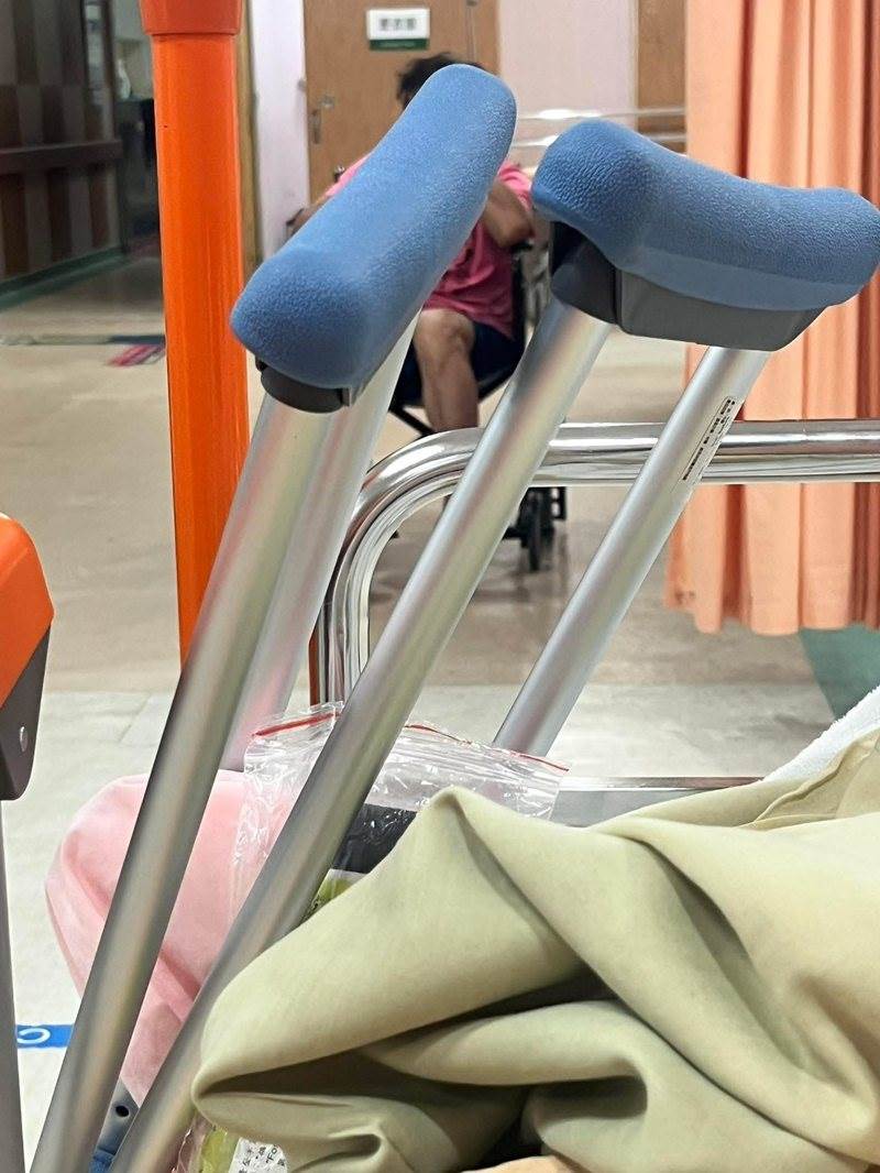 49歲六月(蔡君茹)光復節翻船!她分享右腳踝腫脹成圓球以及上擔架照片,一問之下原來是今天打羽球比賽,「要跳起來殺球時」扭傷,幸好就醫後並未骨裂,就是挫傷,但接下來得靠拐杖走路了。