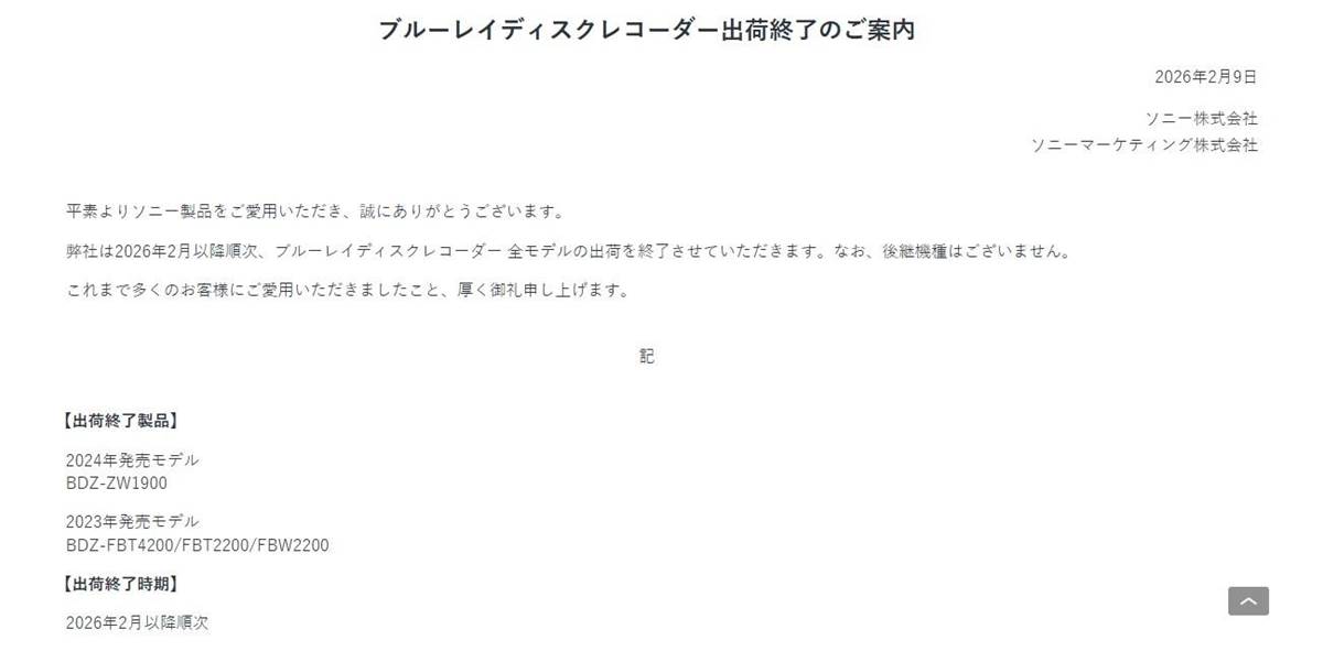 儘管公告指出,出貨將持續至2026年2月,但報導提到,Sony實際上已經停止了錄放影機的「生產」作業,目前僅是在消化最後庫存。