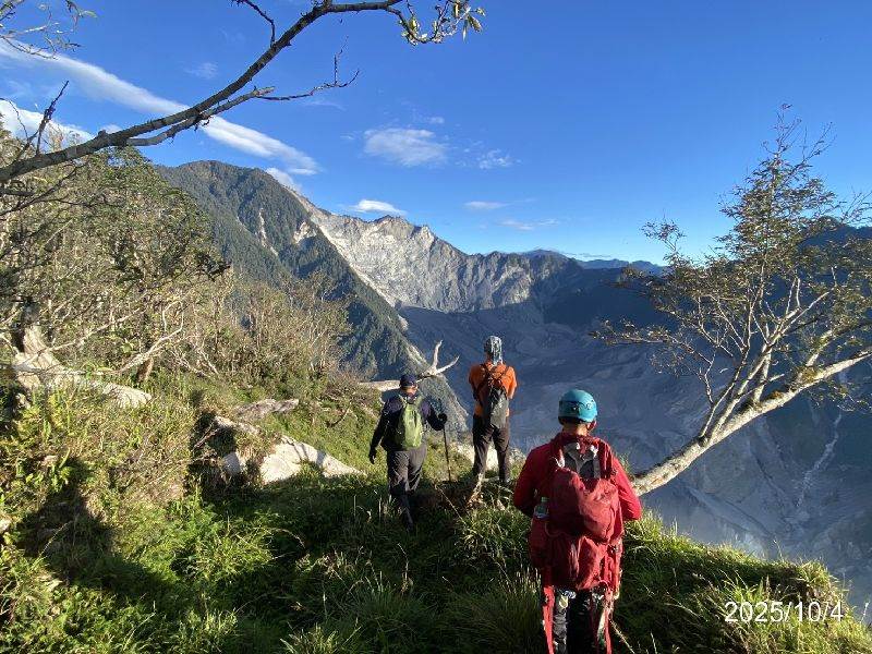 花蓮分署表示,此次踏察山域全程無既有山徑,必須依靠繩索垂降、徒手攀爬等方式前進,沿途環境極為艱困,經過多處坍方、崩塌與厚層泥流堆積區,地勢陡峭、土質鬆軟且地面濕滑,部分路段須攀附樹根或繞行坡壁才能通過。
