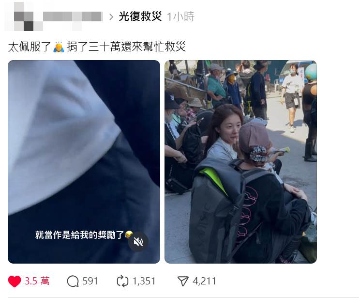 一名網友稍早在Threads發文,表示「太佩服了!捐了30萬還來幫忙救災。」
