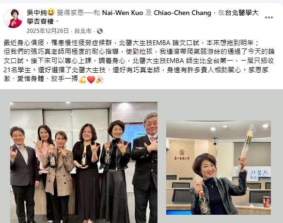 吳中純最後一次在臉書發文是在去年12月26日,當時她寫到自己罹患慢性疲勞癥候群,同時在準備北醫大生技EMBA論文口試。