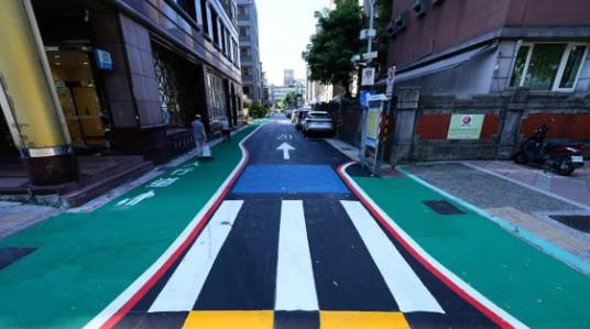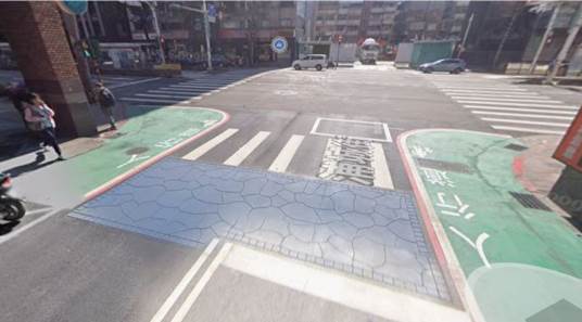 其實,這馬路上的藍色區塊是台北市政府「行人友善區」的規劃之一,目的是為了提醒駕駛人減速、禮讓行人,且藍色路面還有柏油壓花,使車輛經過時會產生輕微震動,進一步做到警示效果。