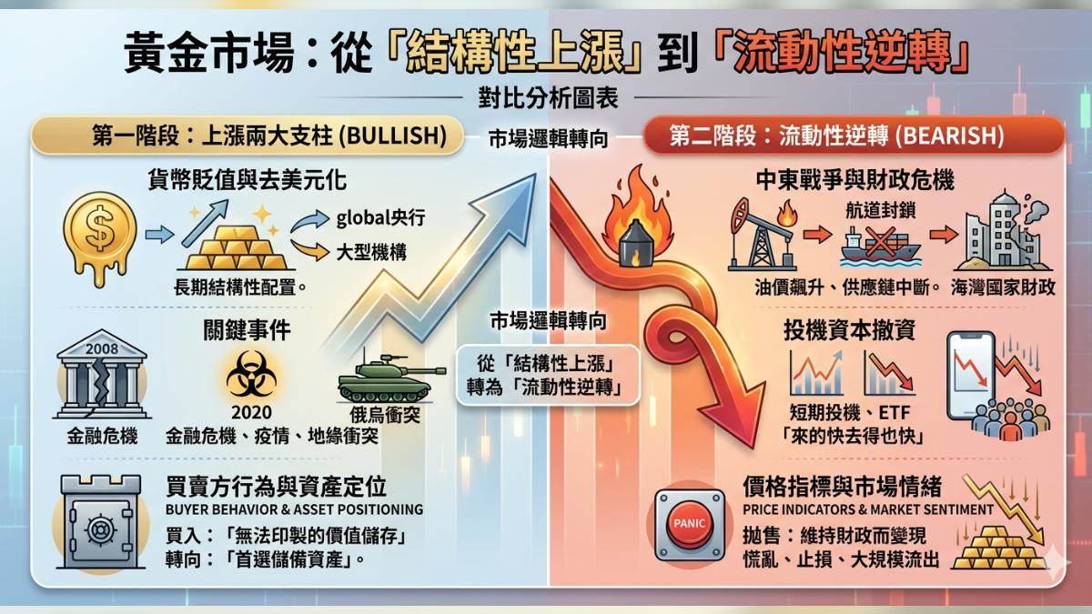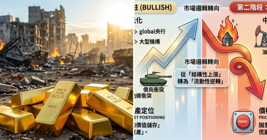 黃金市場流動性修正《金融時報》(Financial Times)報導,渣打銀行大宗商品研究主管庫柏(Suki Cooper)分析,金價在過去一個月,受到流動性需求暴增和聯準會(Fed)降息無望的打擊下走跌。尤其投資人在股市跌、現金需求增加的時候,會優先選擇流動性高又不易虧損的資產,黃金就是首選。因此,金價雪崩並非對戰爭的避險失靈,而是短期流動性暴增吃不消。更多新聞:川普演說懶人包》宣告美伊戰爭將結束!5大重點看油價、金價與股市走勢庫柏表示,以歷史脈絡來看,這種流動性突然暴增的需求,往往會在危機事件發生的四至六週內對黃金構成壓力。
